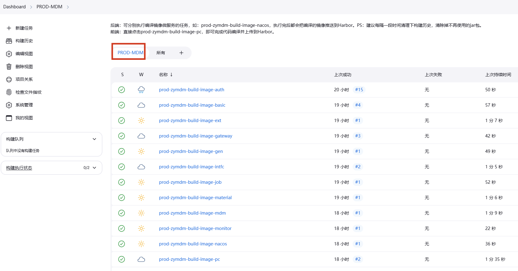 登录Jenkins(正式:10.0.9.103:8088;测试:10.0.5.69:8089),找到PROD-MDM视图,如下: